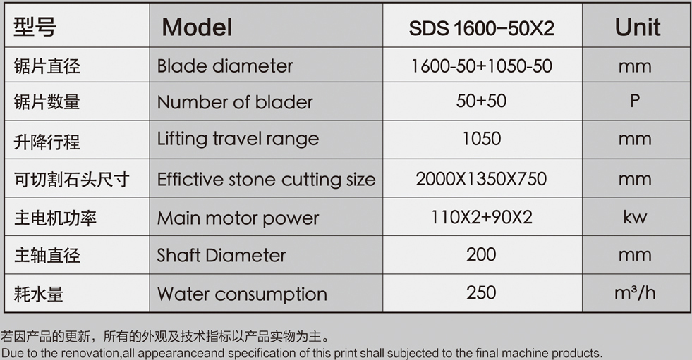SDS-1600-50X2 隧道式多機組聯(lián)合切石機是一種免建廠房可直接安裝于礦山上的石材加工設備。縮短建設周期,提高投資效率;可大大降低石材廠投資成本。該設備為流水線生產(chǎn)方式,鋸片采用同直徑為一組,鋸片直徑從小到大的階梯分布方式。每組鋸片只負責切割一小段,這樣切割可有效減少斧頭板、彎板、斜板等的產(chǎn)生。 整機采用封閉式箱體結構,大大減少了石材加工過程產(chǎn)生的噪音及粉塵污染。并在箱體內(nèi)部分布多個監(jiān)控攝像頭,監(jiān)控切割狀況;并且可實時聯(lián)網(wǎng)進行監(jiān)控操作。
